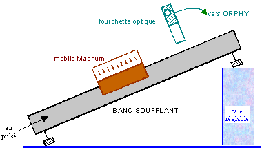 C. Mise en place du banc inclinéInstaller la fourchette optique au-dessus du banc (toujours perpendiculairement au banc) sur son support, dans la zone de départ du mobile pour ne rien perdre du mouvement; vérifier qu'il reste un passage suffisant dessous pour le mobile, mais pas trop pour que le faisceau détecte bien le passage des barreaux de la réglette. Pour déclencher le mouvement lors d'une acquisition, il suffit de lâcher le mobile après avoir mis en route la soufflerie; bien veiller alors à lâcher le mobile sans lui communiquer d'effet latéral (de façon que les actions des coussins d'air latéraux soient bien symétriques). La flèche gravée à l'intérieur d'une des deux dents de la fourchette optique indique le sens positif de déplacement considéré par le logiciel, mais pas nécessairement celui des mouvements réels. Raccorder la fourchette optique aux prises A et E (ou G suivant interface), en vérifiant bien que l'entrée front EF0 d'Orphy n'est pas raccordée par ailleurs: désactiver EF0 sur l'inverseur déclencheur du module de raccordement, ou débrancher carrément ce module de raccordement. D. Visionner l'utilisation du banc incliné (mise en place et acquisition)