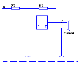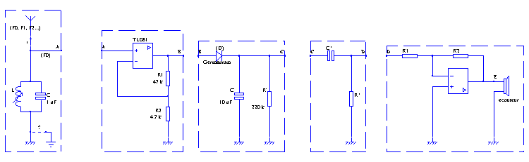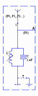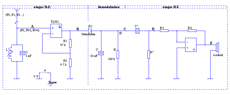 L'antenne a des caractéristiques (forme, longueur, orientation) qui dépendent beaucoup de la gamme d'ondes choisie. Pour les G.O., on pourra se contenter d'un conducteur de quelques mètres ou encore mieux du corps humain jouant ce rôle (faire des essais...). La liaison éventuelle de la ligne équipotentielle 0 V (ou masse) à la Terre peut parfois améliorer (voire détériorer) la réception des signaux: faire des essais. L'antenne peut dans certains cas (postes portatifs non reliés à une antenne extérieure) être constituée de la bobine elle-même: celle-ci devra alors avoir son axe parallèle à la direction de propagation (donc celle dans laquelle se trouve l'émetteur concerné); vous observerez par exemple quelle orientation vous devez donner à votre poste portatif personnel pour obtenir une réception optimale. Bande passante (rappel): une bonne réception implique que l'intervalle {F-f, F+f} soit situé à l'intérieur de la bande passante de la chaîne de transmission (voir A.N. dans les recherches personnelles):concevoir une expérience destinée à mesurer la bande passante d'un circuit antirésonnant. b. Étude expérimentaleConfigurer l'oscilloscope en balayage temporel, avec une seule voie, réf. 0 V à mi-hauteur de l'écran, base de temps calibrée à 2 ms/cm, voie 1 (avec un calibre de grand gain) sur le point A du montage. Chercher soigneusement l'accord (réglage de l'inductance donnant l'amplitude maxima de signal à l'écran) avec le noyau de ferrite, et ne plus modifier sa position. Observer alors la forme du signal obtenu. Mesurer l'amplitude moyenne Û du signal observé; puis sa fréquence F en augmentant évidemment la vitesse de balayage (ce qui demandera probablement, pour avoir un oscillogramme satisfaisant, de passer en déclenchement manuel). De quel émetteur s'agit-il? Calculer la valeur de L ainsi déterminée. Chercher au niveau de l'antenne les réglages optima d'après les paramètres vus au § (a). Chercher de même les fréquences d'ondes porteuses d'autres stations éventuellement captées: France inter: 1 829 m Europe 1: 1 648 m RTL: 1 282 m RMC: 1 400 m (rappel: c=3*10 8 m/s pour les ondes électromagnétiques dans le vide ou l'air).Revenir à une vitesse de balayage de 2 ms/cm: la modulation d'amplitude est-elle visible? 2. Pré amplification H.F.