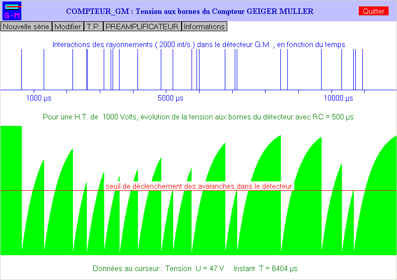 Une visualisation du fonctionnement du détecteur permet de se sensibiliser sur l'action de la Haute Tension appliquée au détecteur ainsi que de la constante de temps RC.